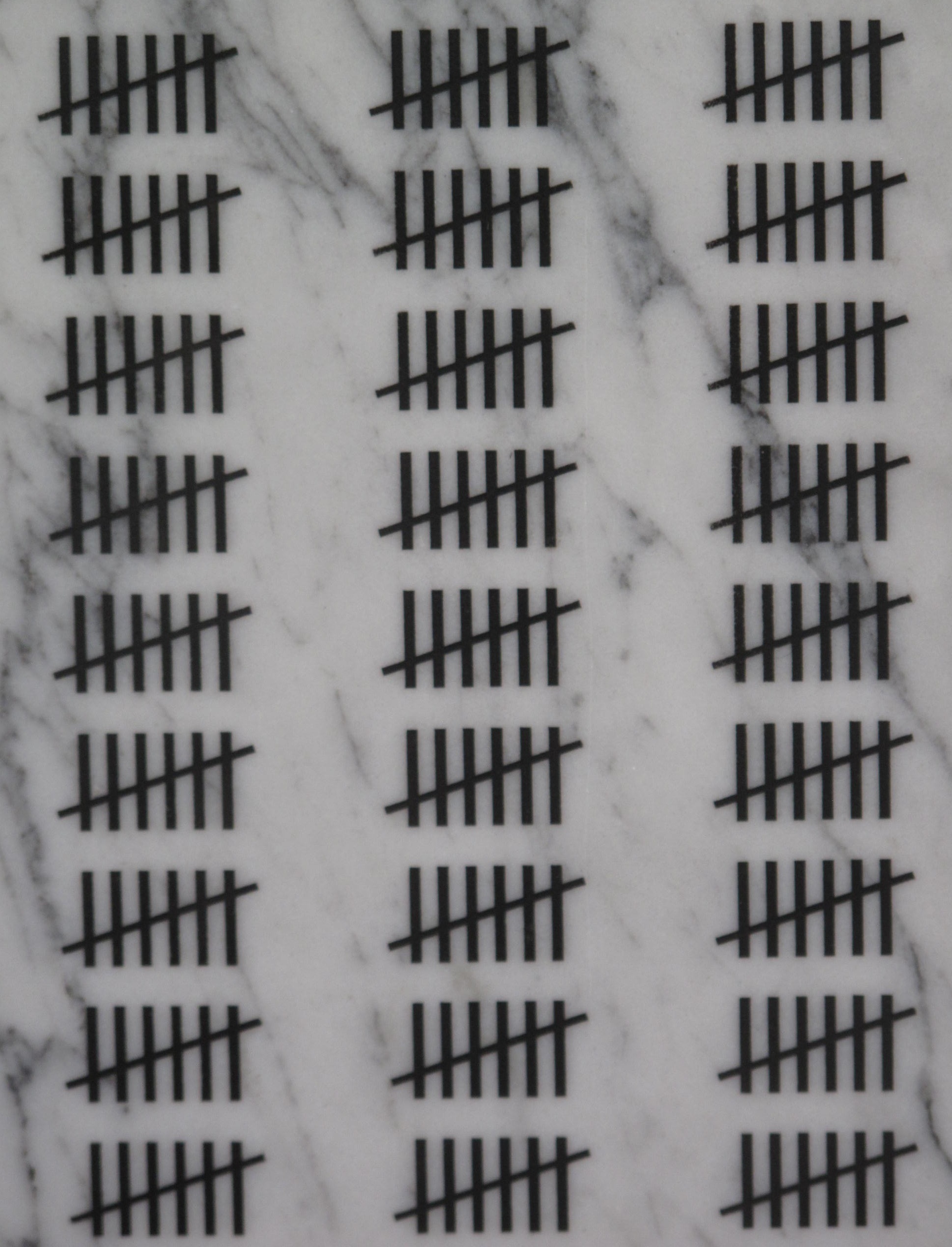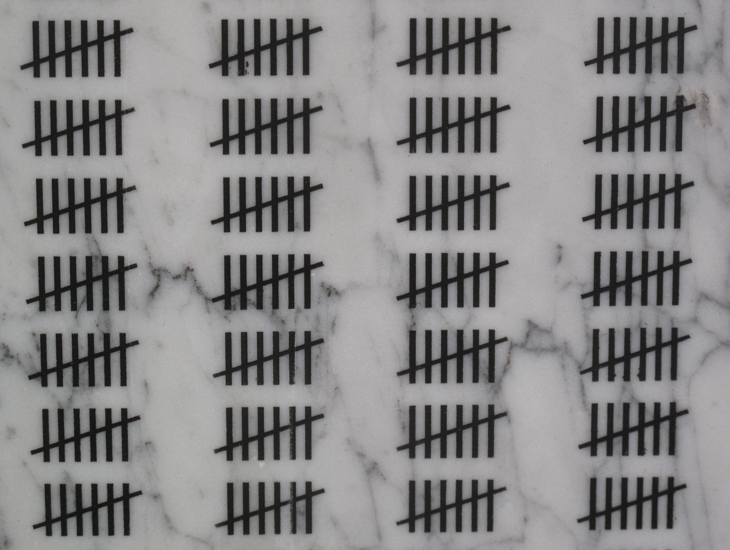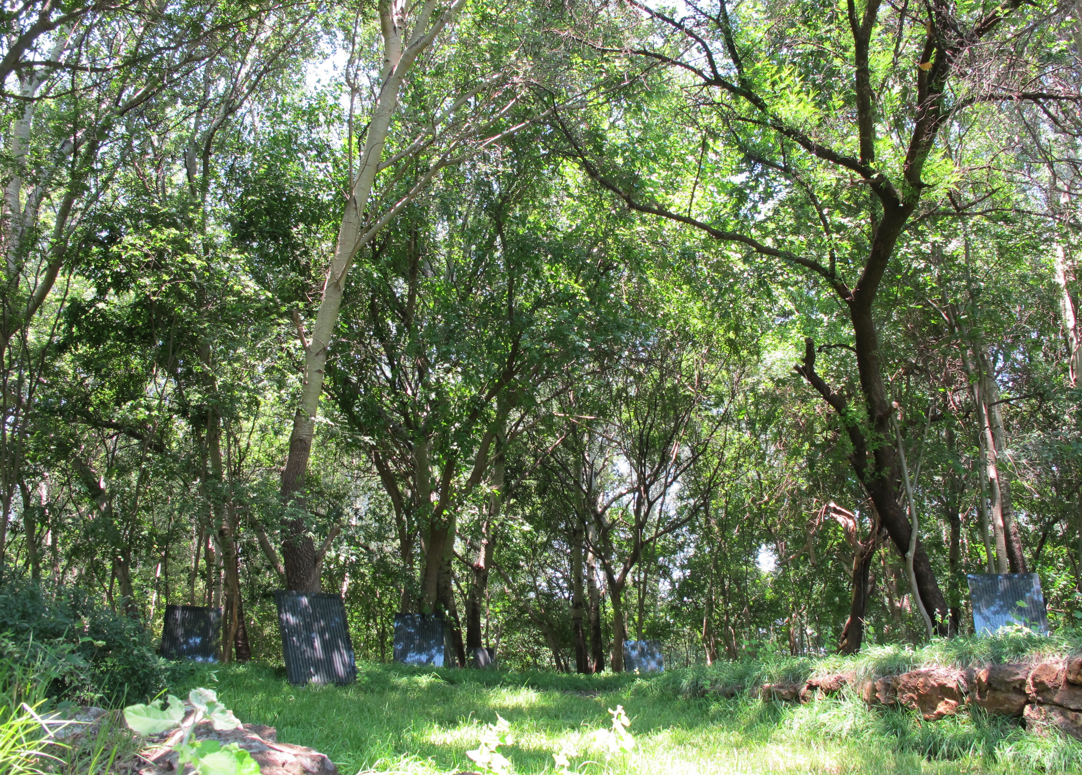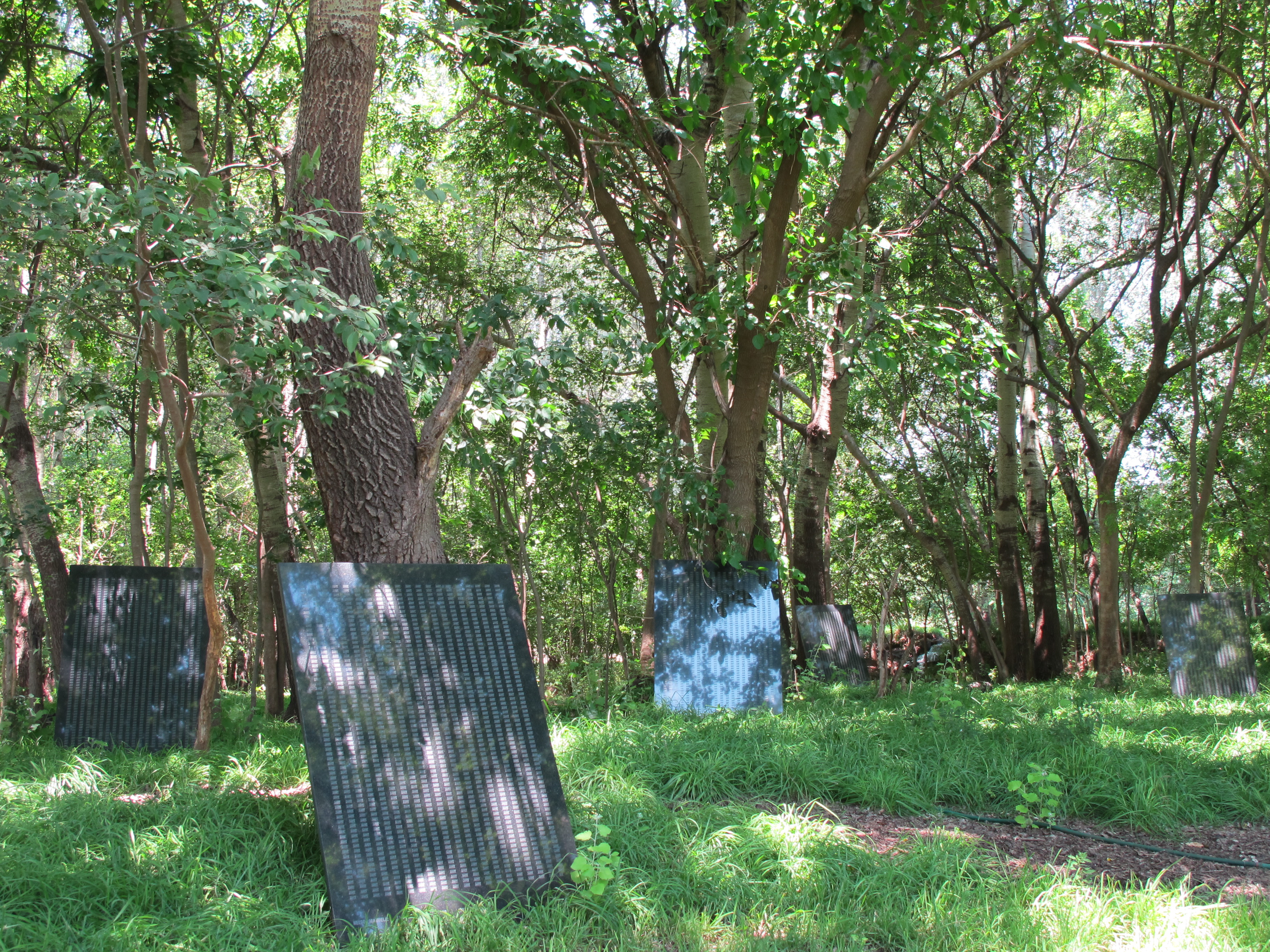 Methods of display: At Constitutional Court: Long steel bars fixed to the building, holes drilled in the back of the granite panels, bolts cemented into these holes, then bolted through the steel bars. At Gordon Schachat Residence: A large stand concreted into the ground. The stand has steel channels at top and bottom. The granite panels were slid into the channels. Standard method: Custom made brackets are fastened to a wall so that top and bottom of work fit snugly into them. The bottom bracket is lined with black double-sided tape and the granite panel rests on the tape and bracket. The top bracket has a thin, loose bar of steel as wide as the panel’s thickness and this loose bar has a lip that overlaps the top of the panel slightly. This bar is screwed down on the work with sunken grub screws and Allen keys. The bottom bracket carries the weight of the panel and the top bracket with its loose bar and lip keeps the work from falling forward. At NIROX sculpture park. The eight panels were randomly stood up against trees in a chosen section of forest. Shown in Den Haag, Netherlands, as part of the exhibition entitled AFTER THE RAINBOW NATION.
