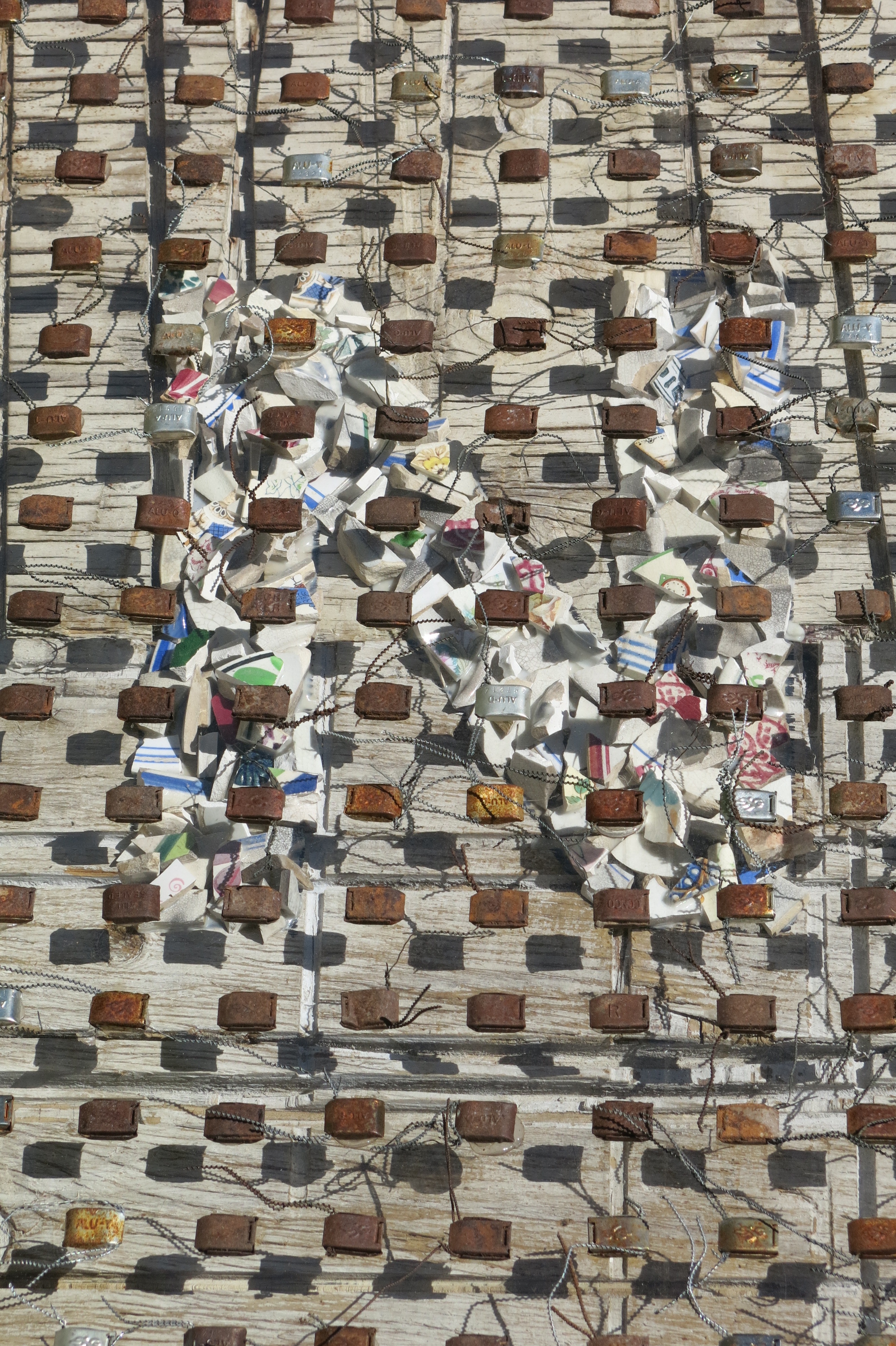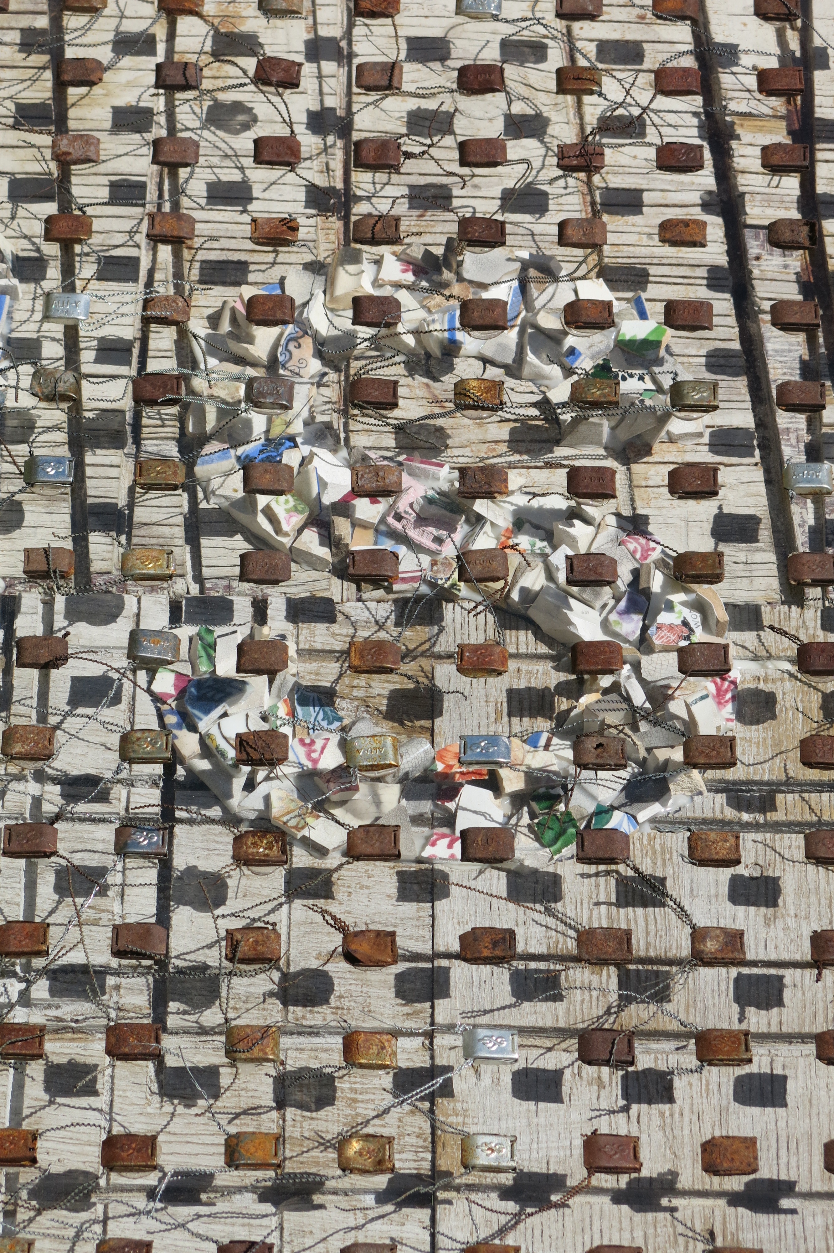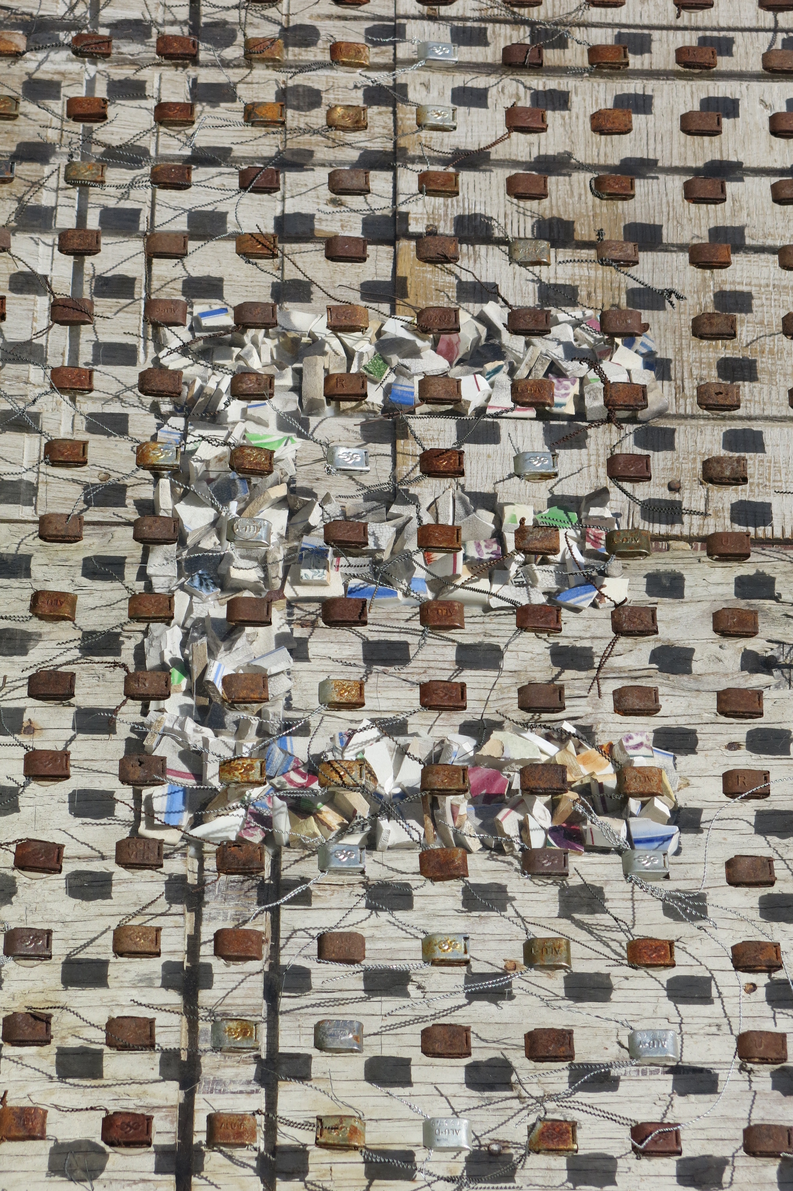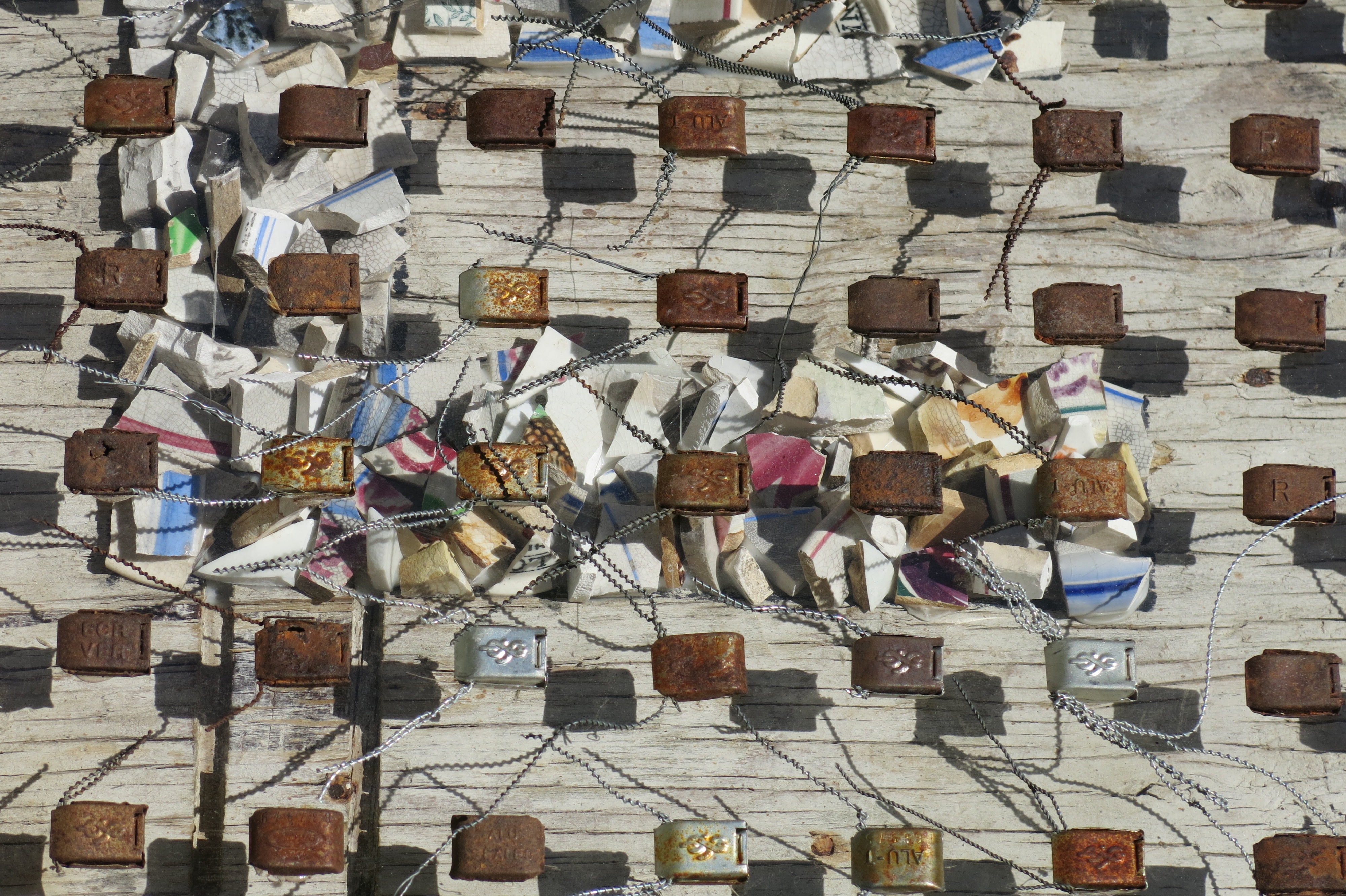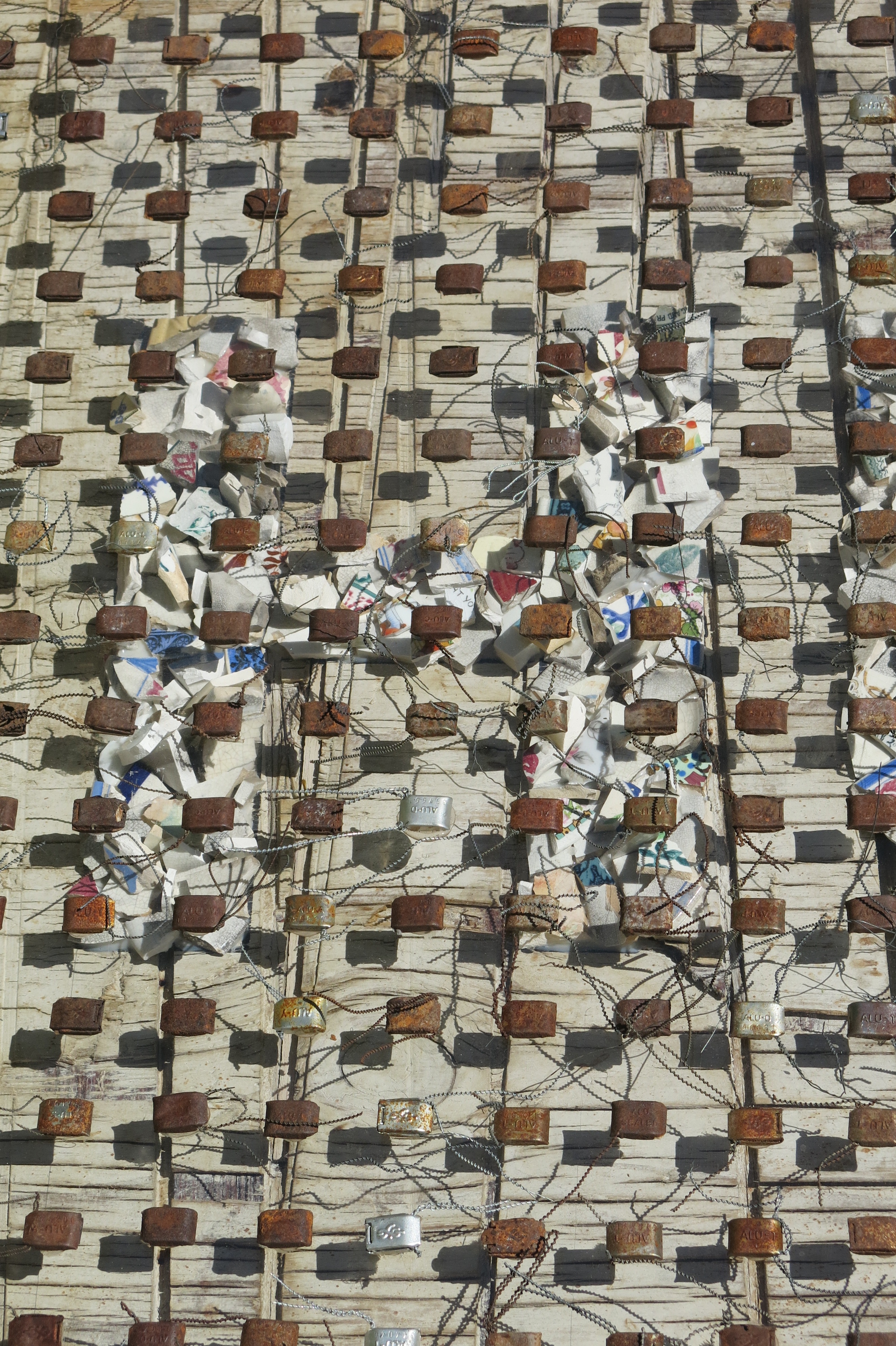 Broken porcelain shards, 2100 industrial seals/locks, extruded acrylic, used plywood base-boards