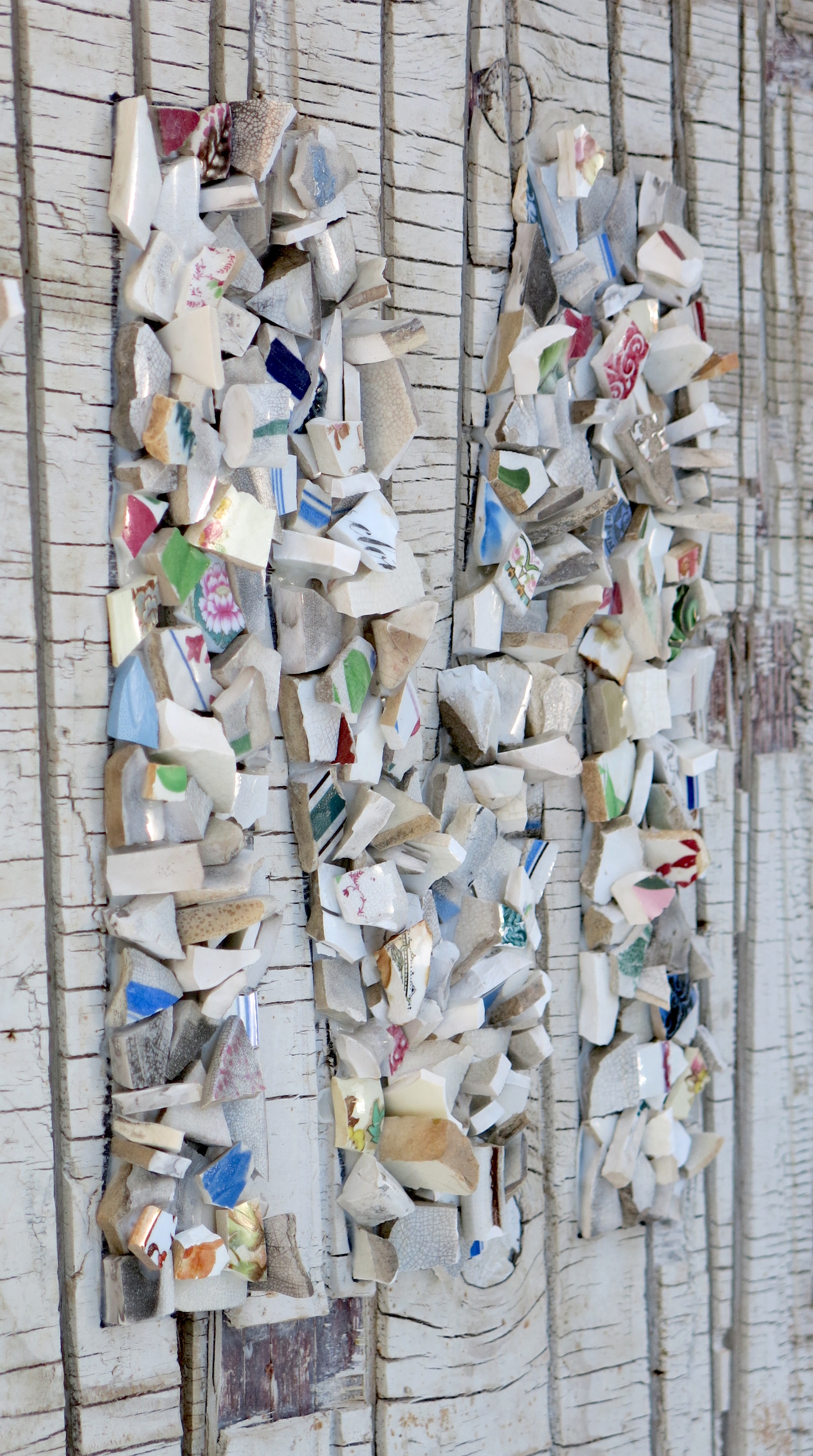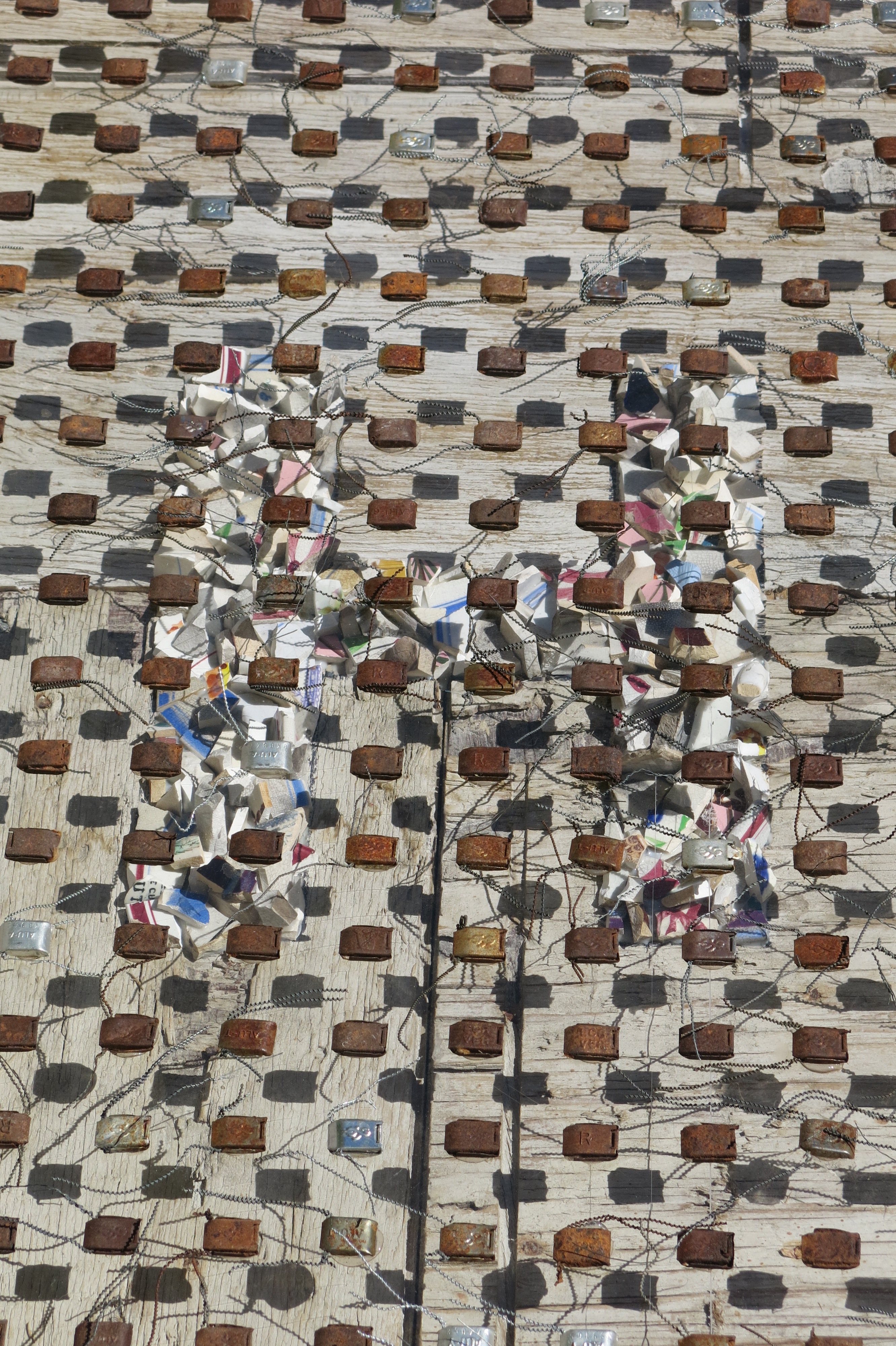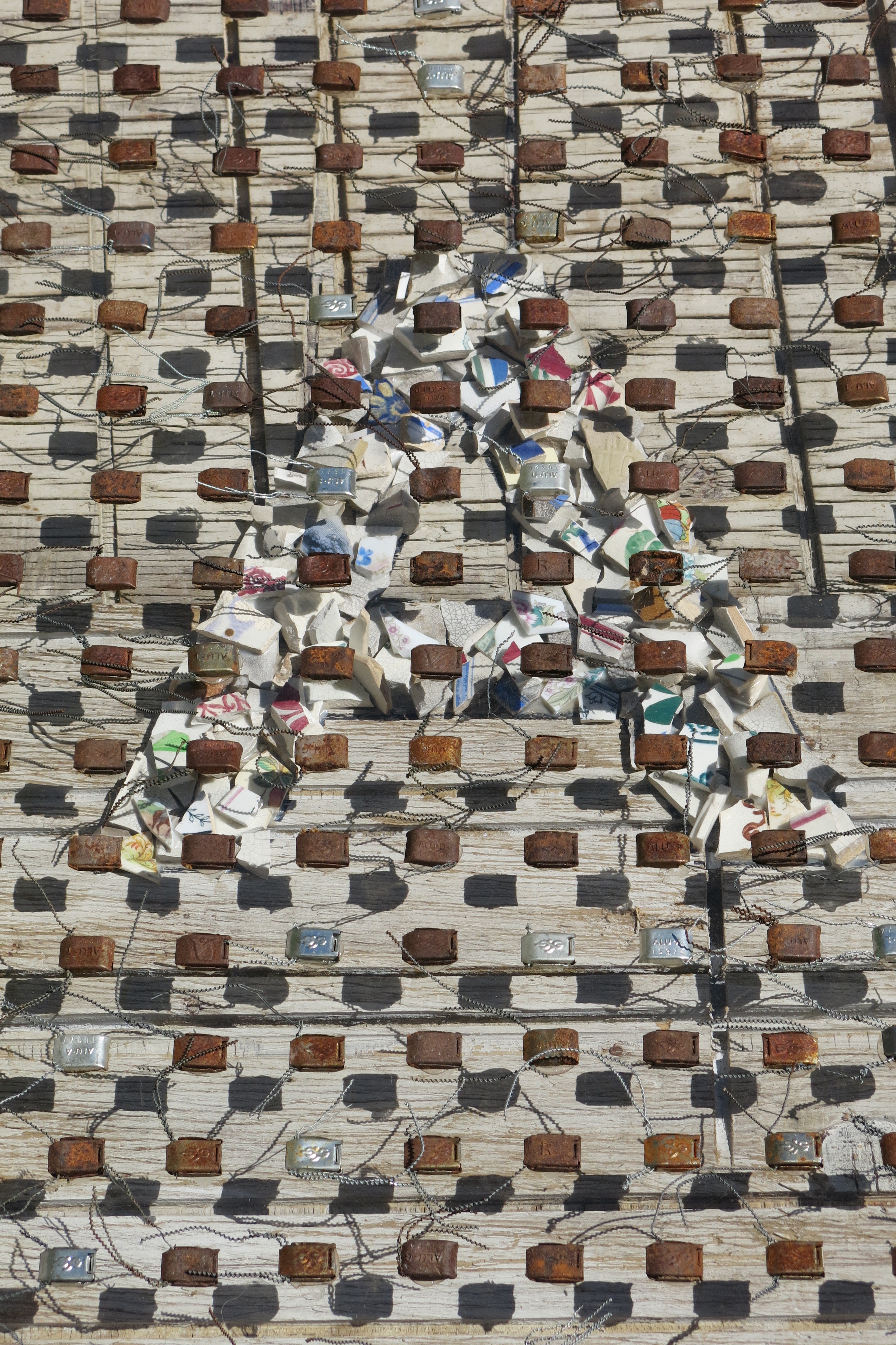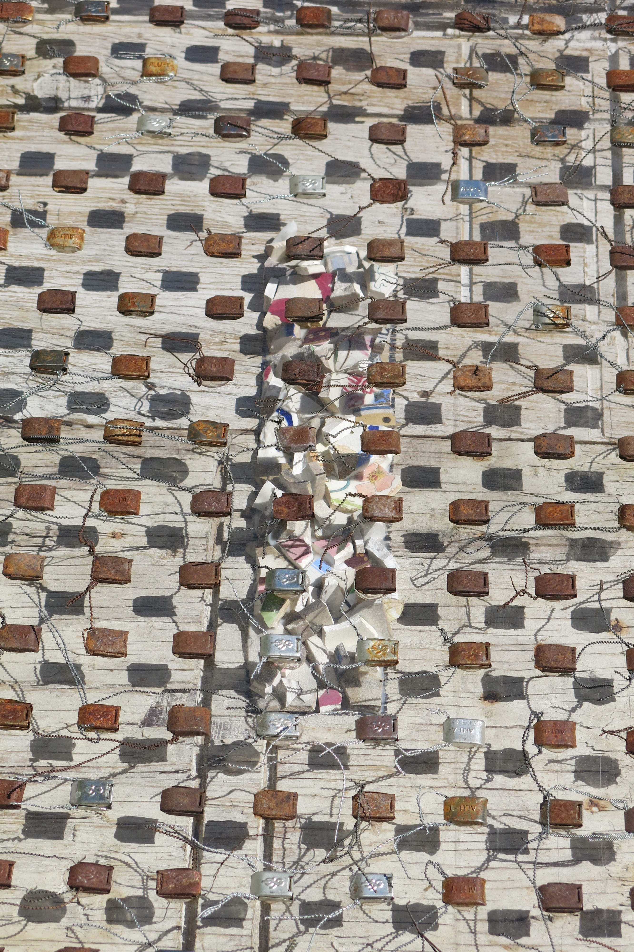 Broken porcelain shards, 2100 industrial seals/locks, extruded acrylic, used plywood base-boards