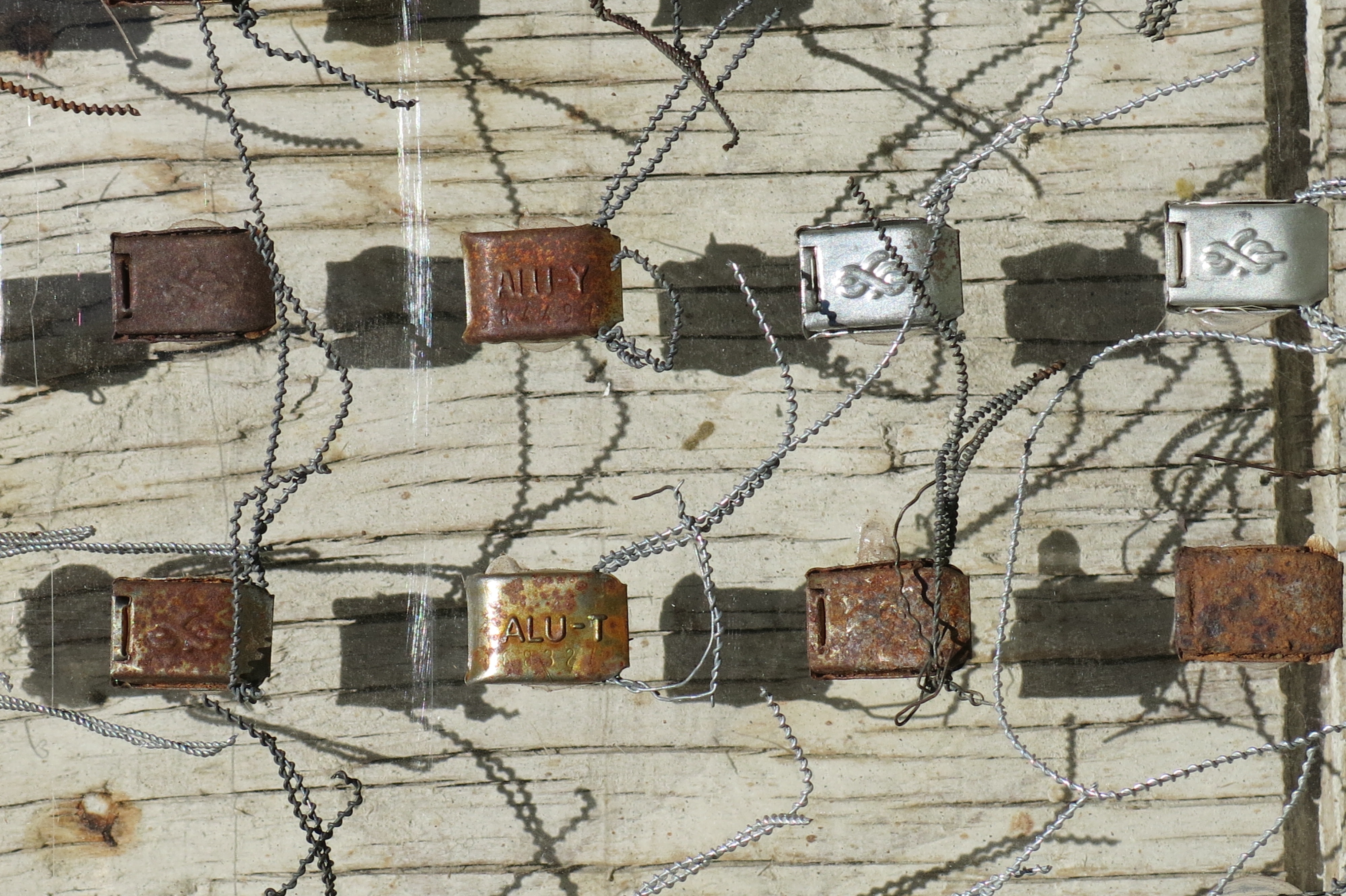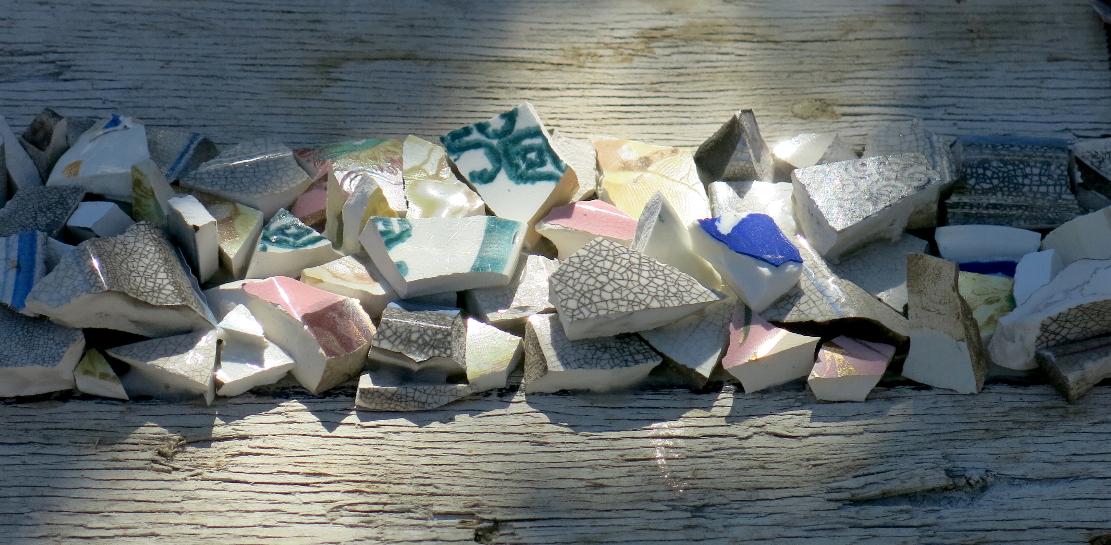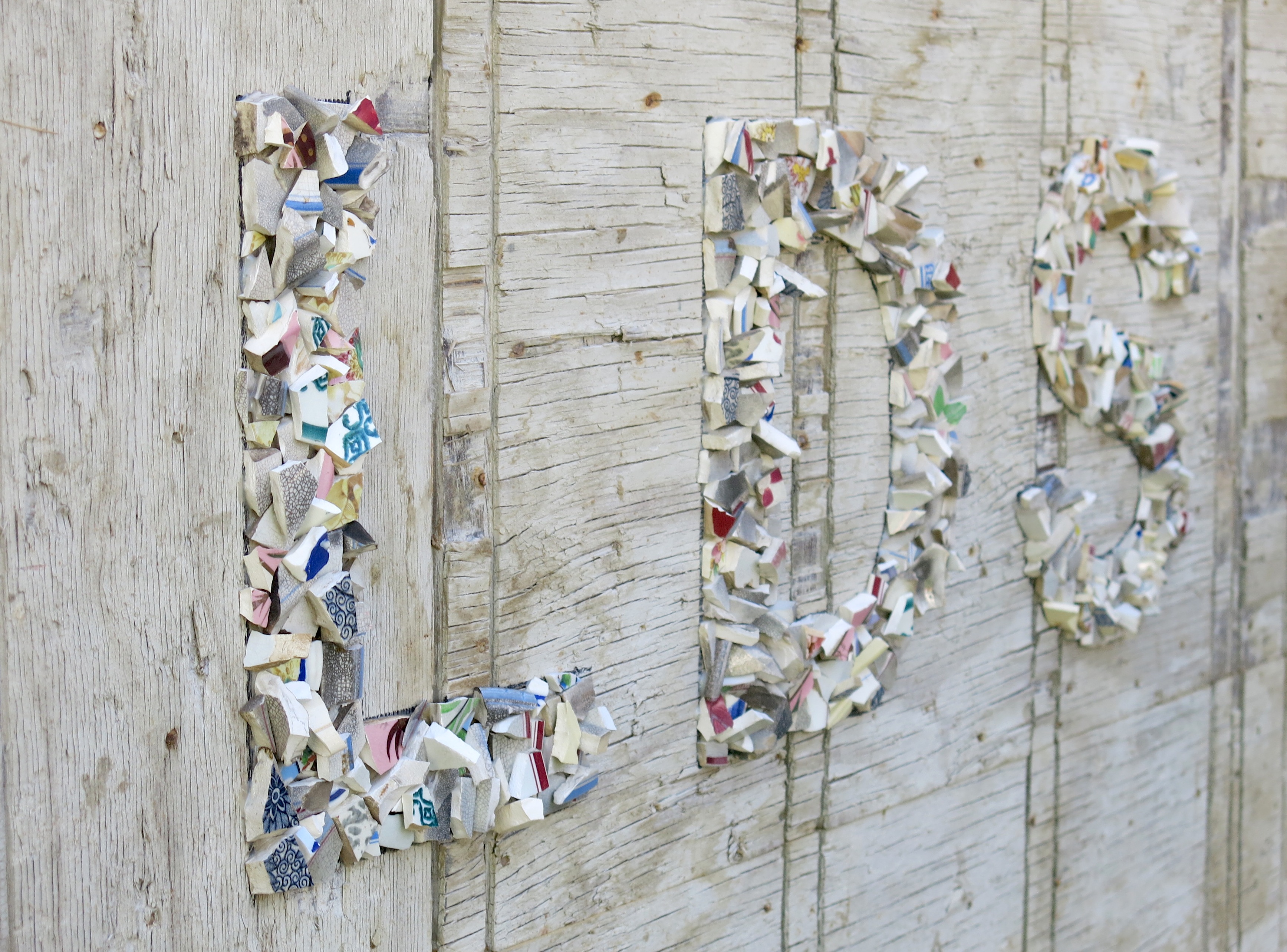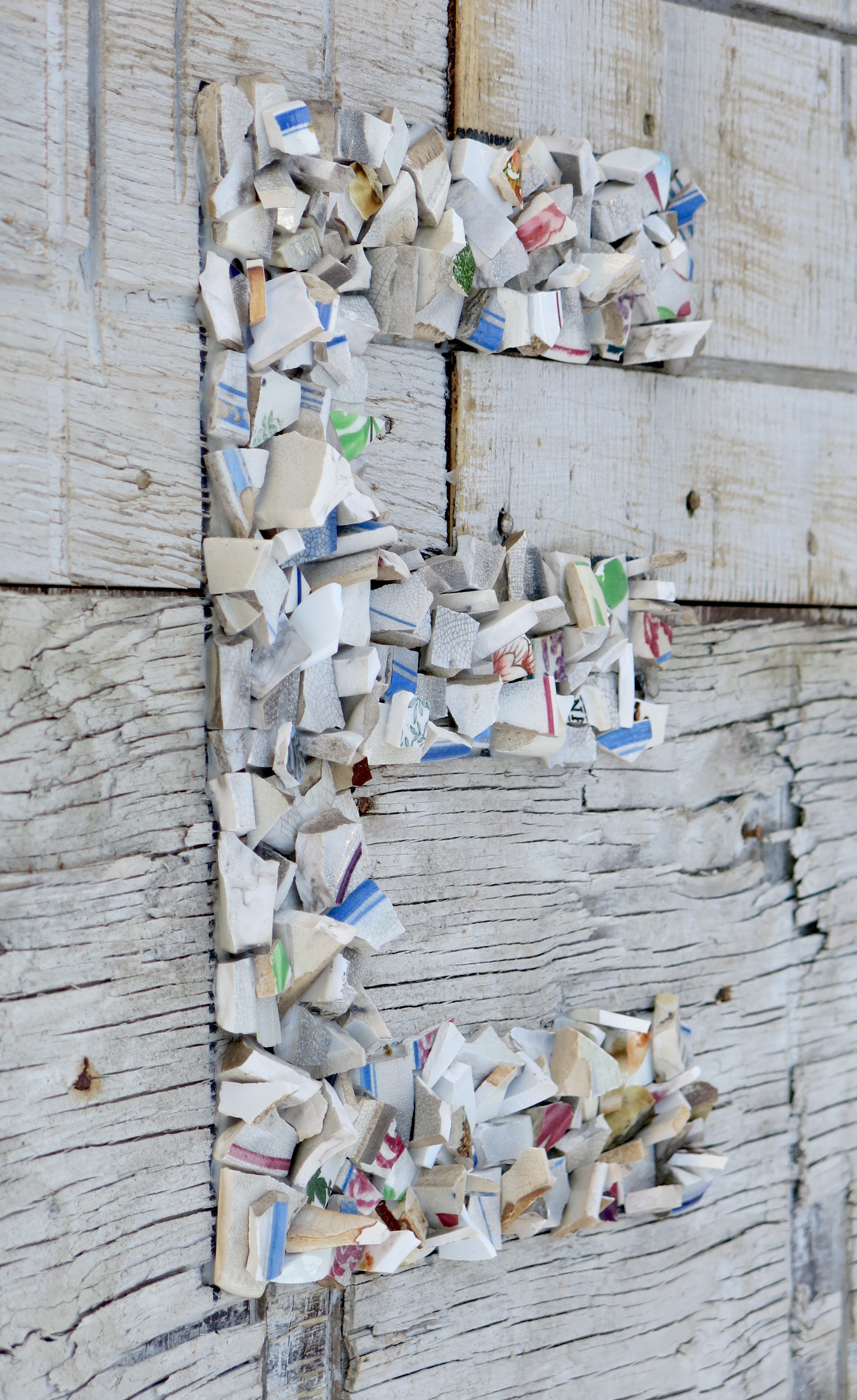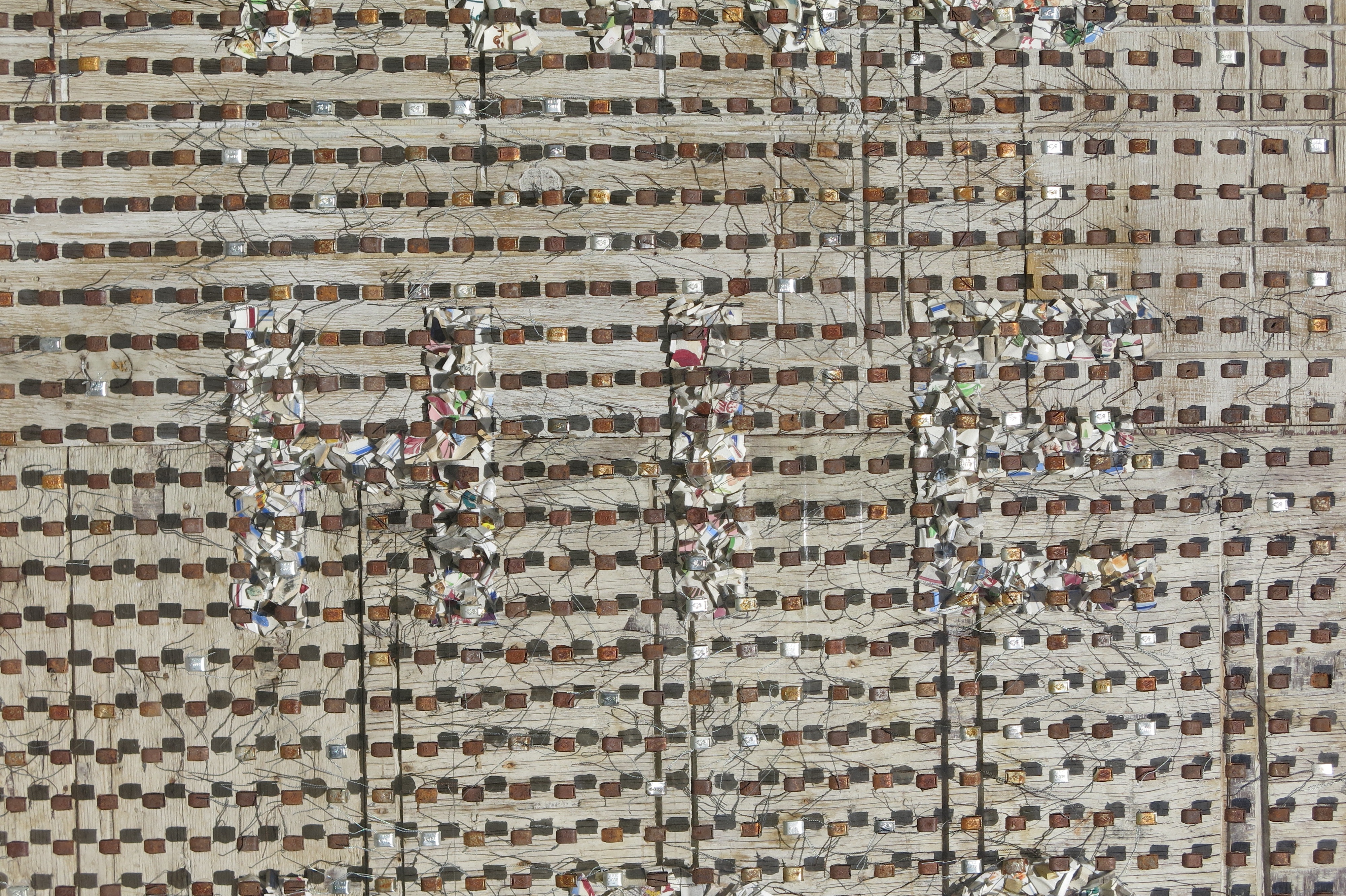 Broken porcelain shards, 2100 industrial seals/locks, extruded acrylic, used plywood base-boards