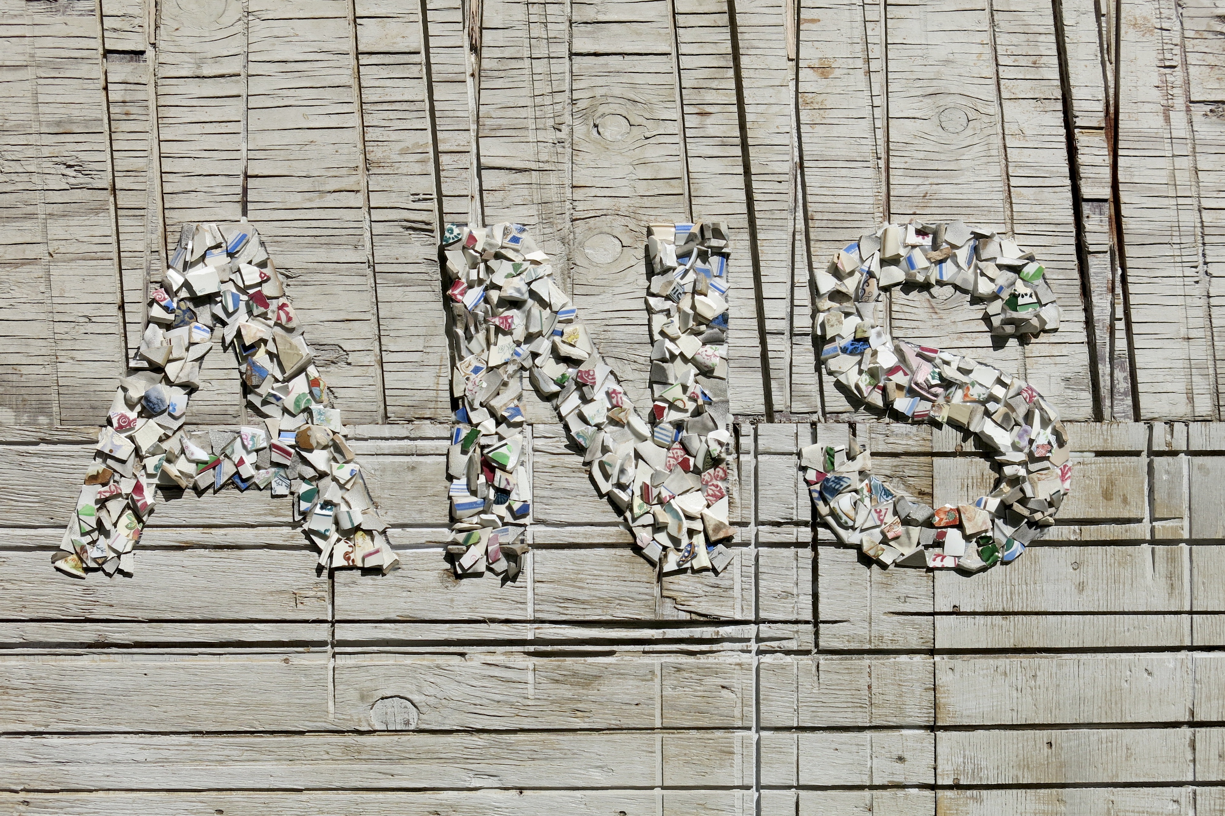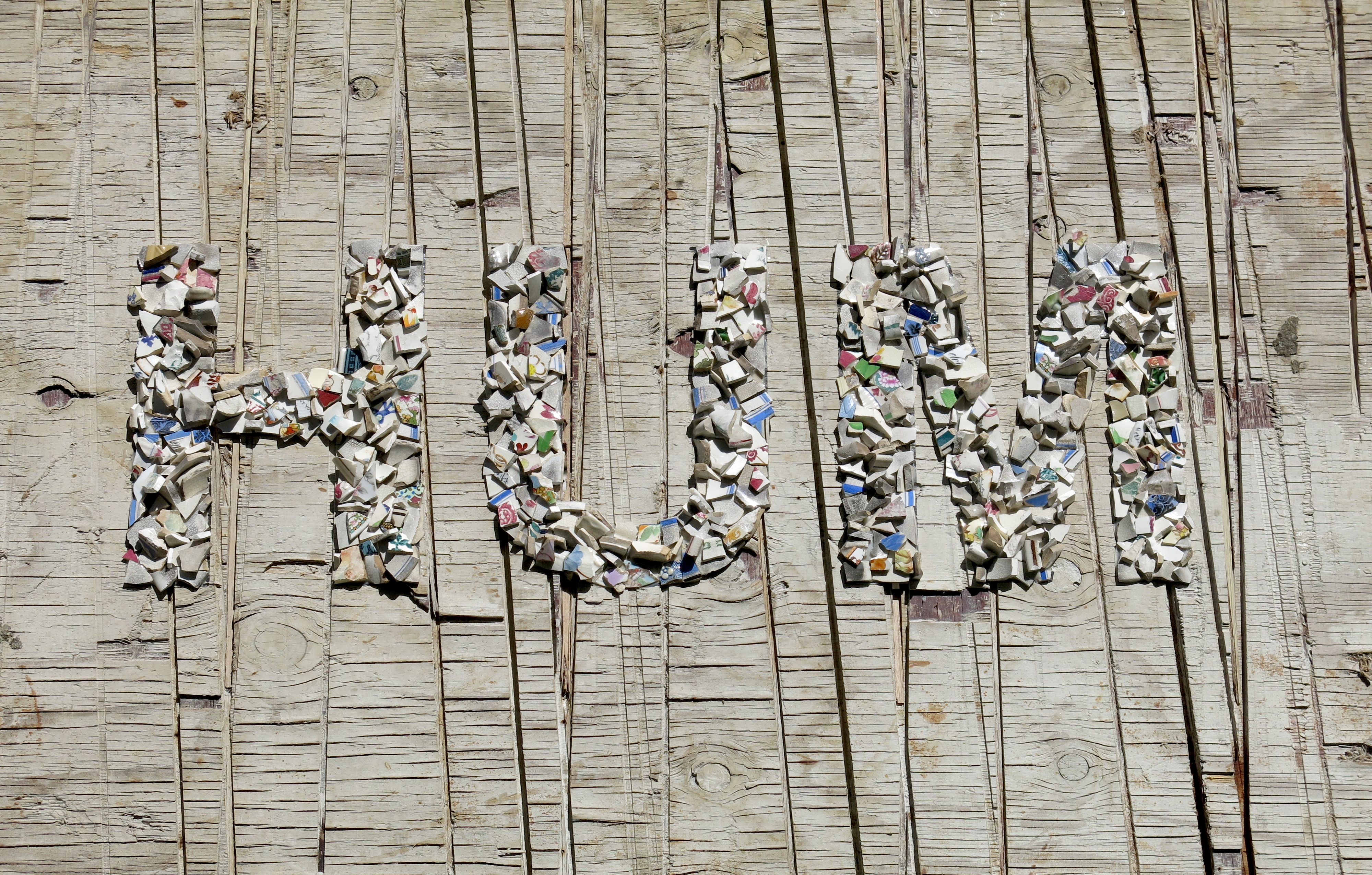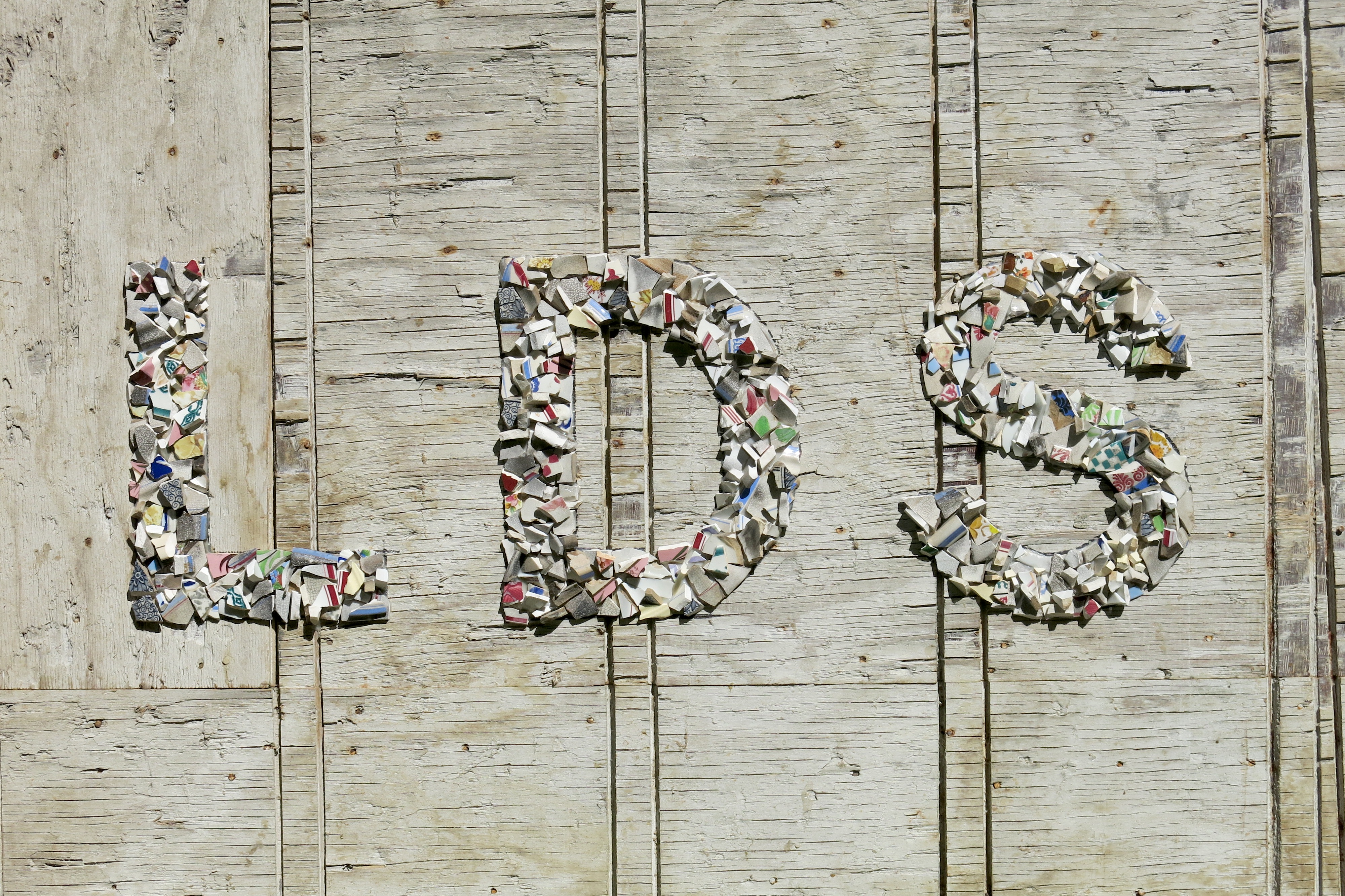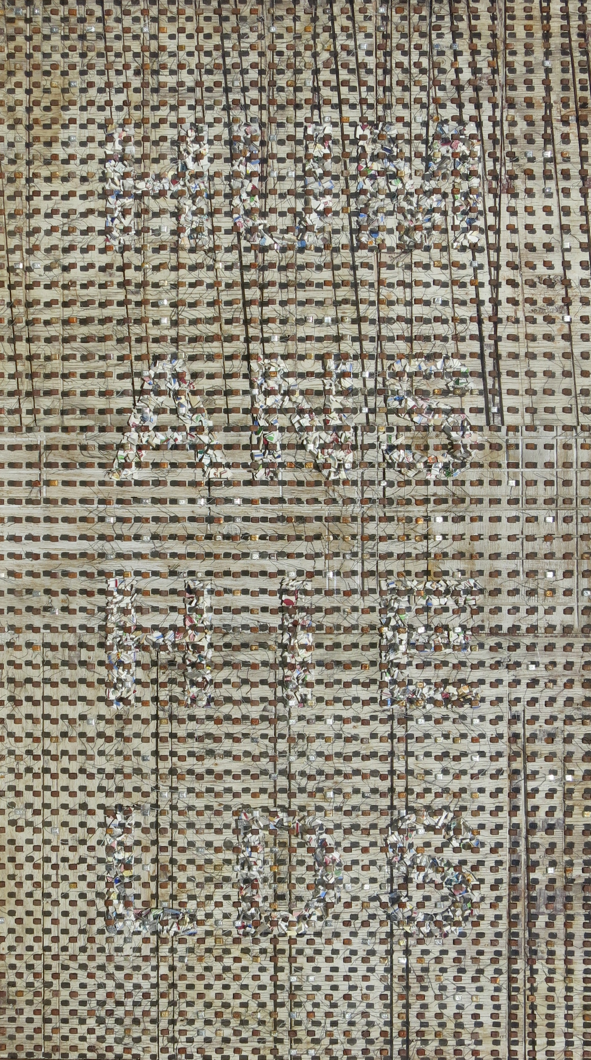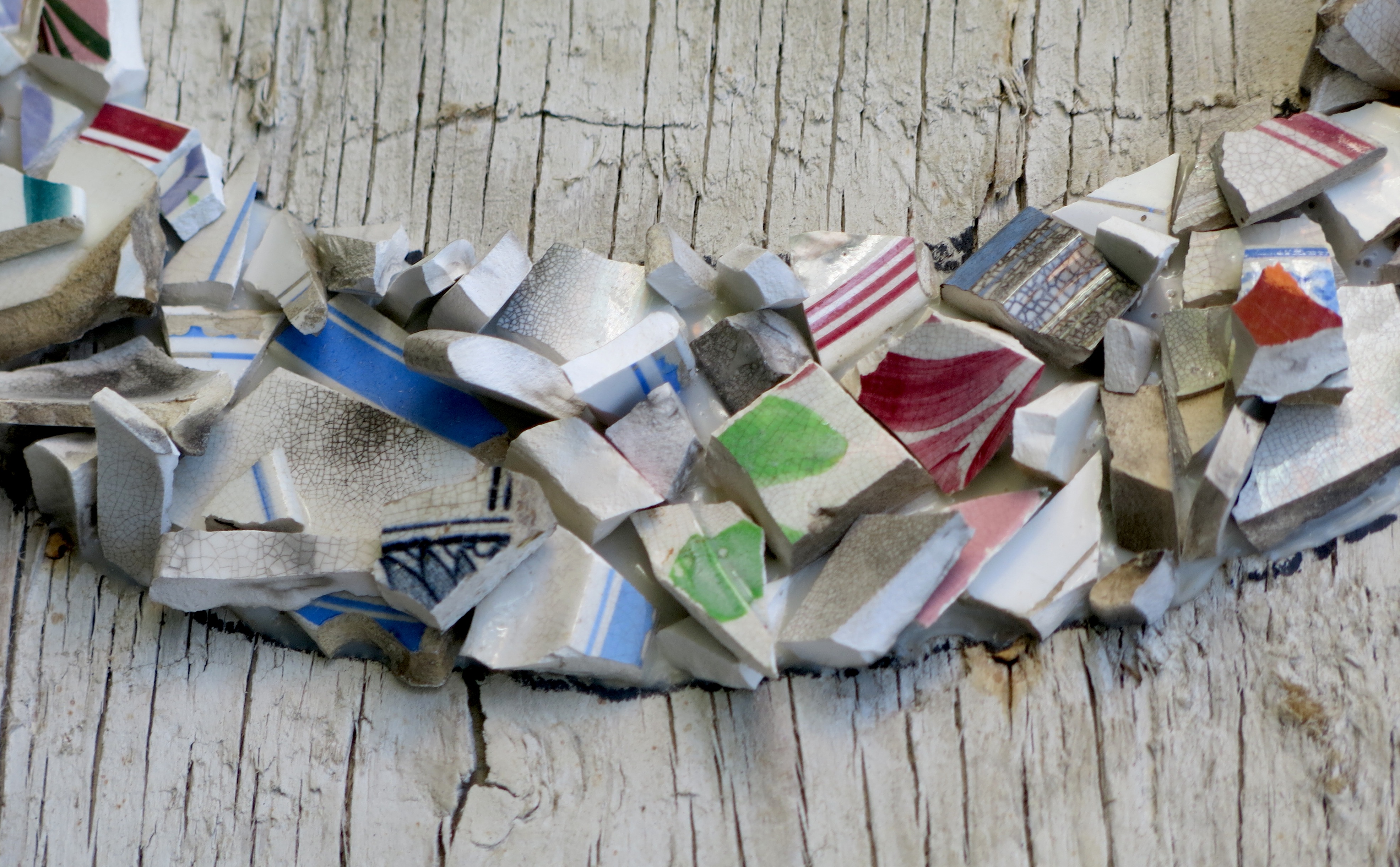 Broken porcelain shards, 2100 industrial seals/locks, extruded acrylic, used plywood base-boards